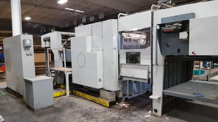 ONE USED BOBST PLATEN DIE CUTTER SP 1600 EQUIPPED WITH: PILE FEEDER, SIDE DIE LOADING, DUAL STAGE STRIPPING, LEAD EDGE TRIM REMOVAL SYSTEM AND PILE DELIVERY SYSTEM