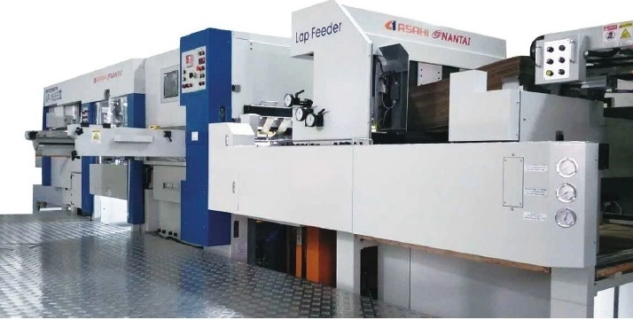 ASAHI AUTOPLATEN DIE CUTTER EQUIPPED WITH NON-STOP SERVO FEEDER, COMPUTERIZED SET-UP, ORDER CHANGE SET-UP CAN BE DONE UNDER 1 MINUTE, TORQUE LIMITING DEVICE IN DIE CUT SECTION FOR SAFETY, CAPABLE OF DIE CUTTING FROM MICROFLUTE TO DOUBLE WALL, TWO STEP SHEET REGISTRATION SYSTEM (FIRST STEP CARRIED OUT BY SERVO CONTROL VACUUM FEEDER AND THE SECOND STEP IS BY BAFFLE POSITIONING DEVICE), CAPABLE OF 100% STRIPPING (INTERNAL, THREE SIDES AND GRIPPER EDGE REMOVAL DEVICE).