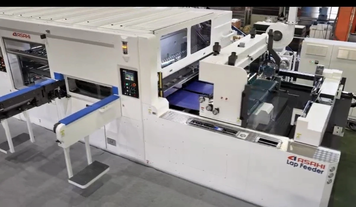 ASAHI AUTOPLATEN DIE CUTTER EQUIPPED WITH NON-STOP SERVO FEEDER, COMPUTERIZED SET-UP, AUTO REGISTRATION ADJUSTMENTS, MAIN MACHINE WITH LAP FEEDER, AUTOMATIC ALIGMENT SYSTEM, PRE-SET COMPUTER CONTROLS, STRIPPING AND GRIP EDGE WASTE REMOVAL DEVICE, BATCH DELIVERY AND UNLOADING DEVICES (SERVO MOTOR), PLATFORM, DELIVERY CONVEYOR, AND CHASE LOADER (INCLUDING 1PCS. CHASE).